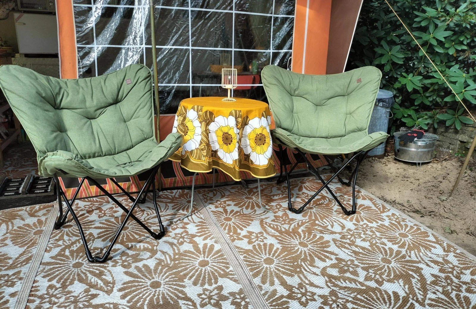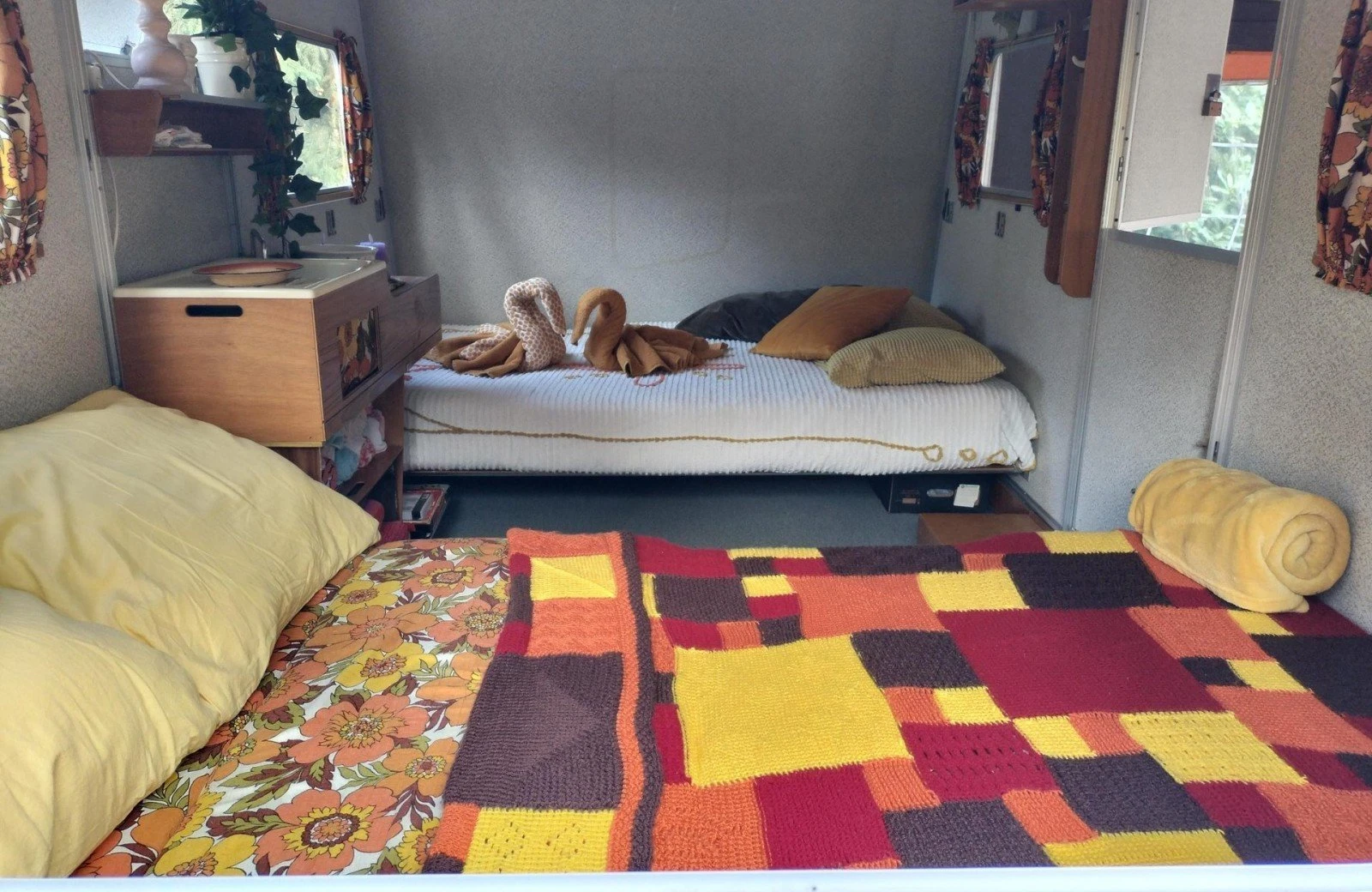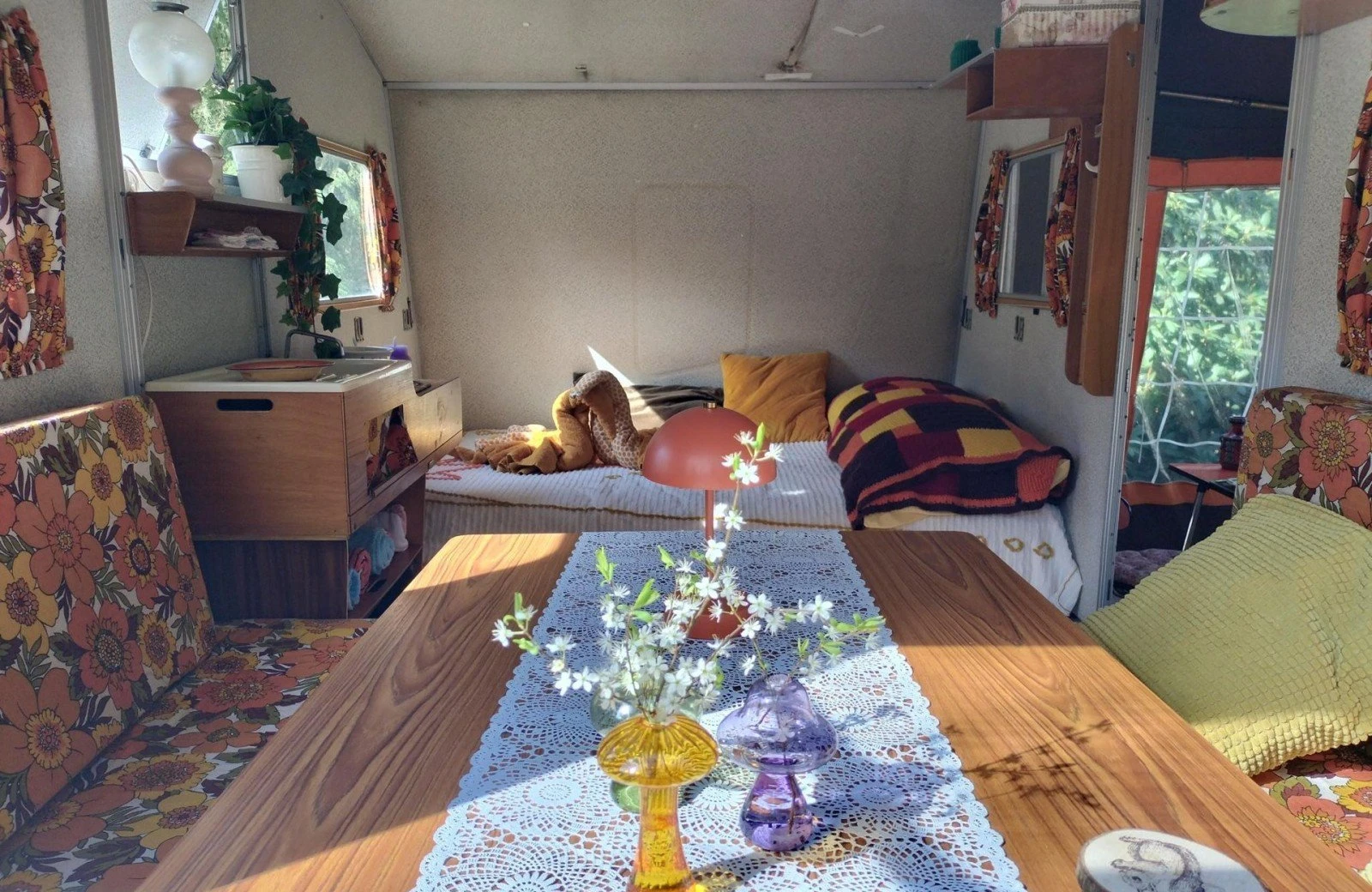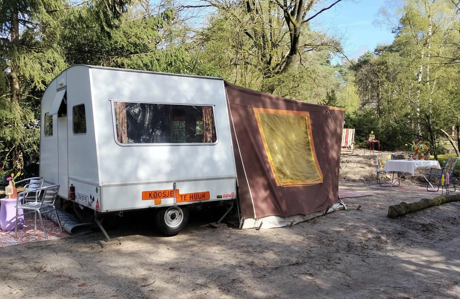 Koosje, de vintage klapcaravan uit 1976, stond voor het eerst in 2023 op Landgoedcamping Het Meuleman, met haar originele voortent. In 2024 en 2025 keerde ze terug en ook in het kampeerseizoen van 2026 staat ze weer klaar. Ze staat op een prachtige plek, nummer 55, vlakbij het heideveld.