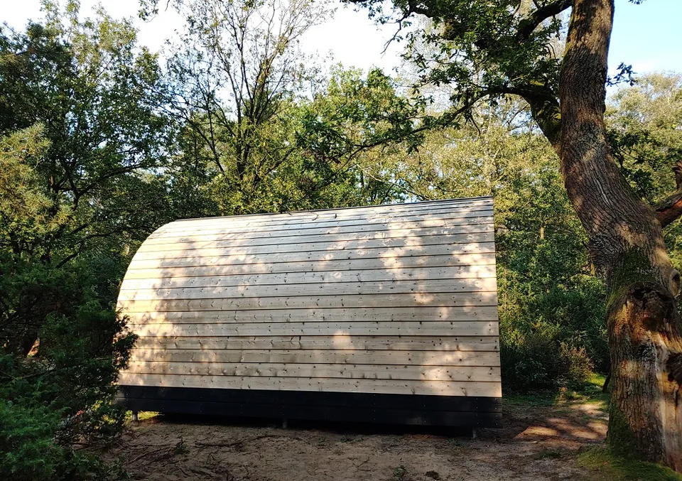 De Natuurpod is eigenlijk een 'tiny house' met een tweepersoonsbed, een keukenblokje en een verwarmde douche/toiletruimte.