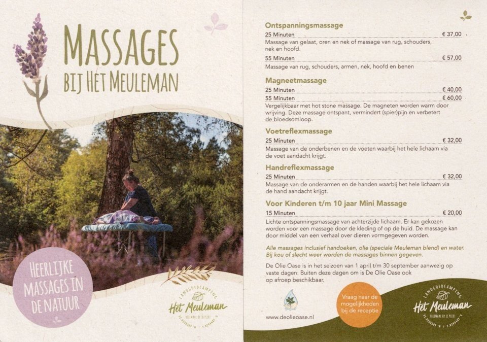 Zie hiernaast de mogelijkheden voor massages bij Het Meuleman (seizoen 2025).