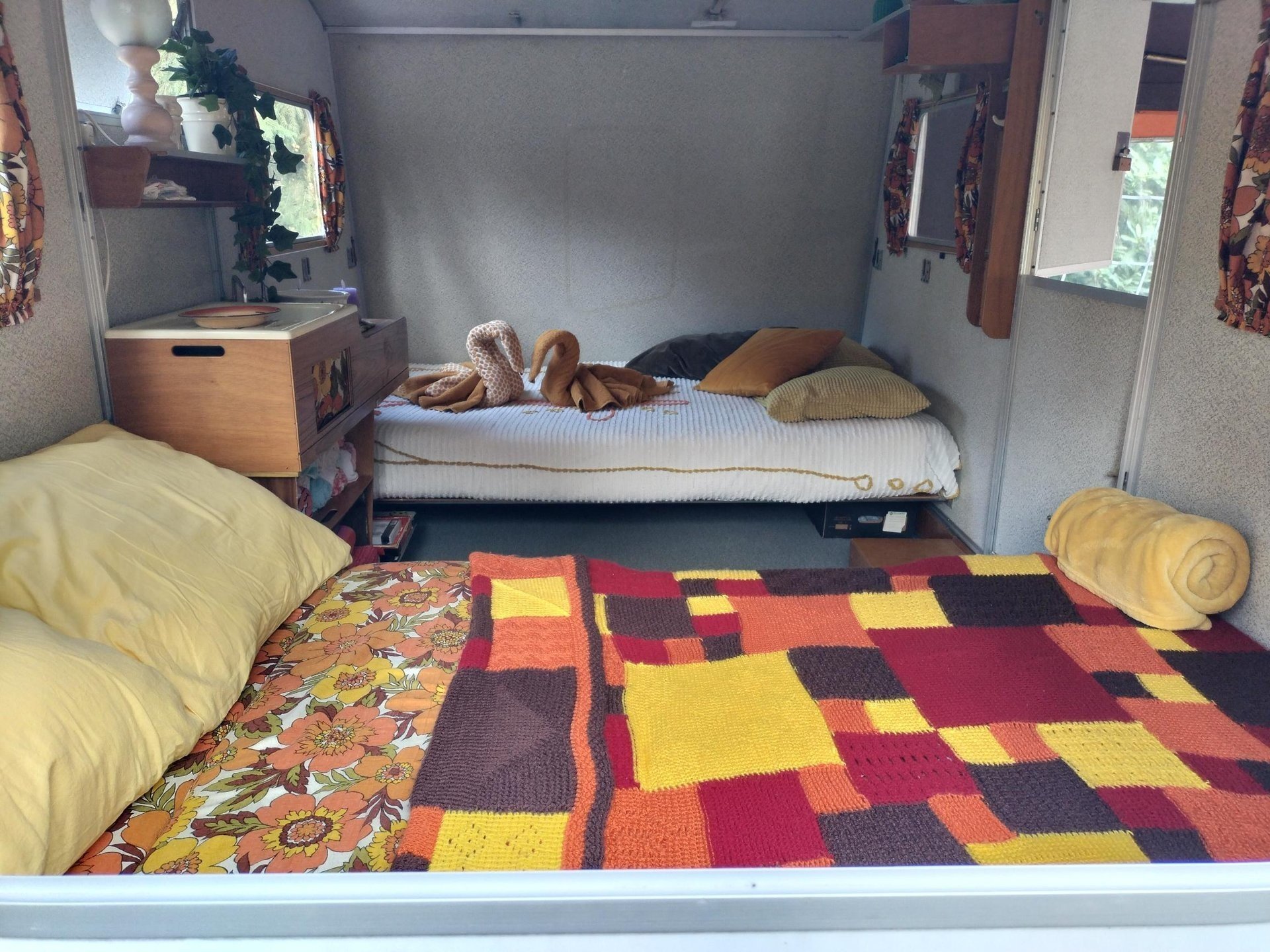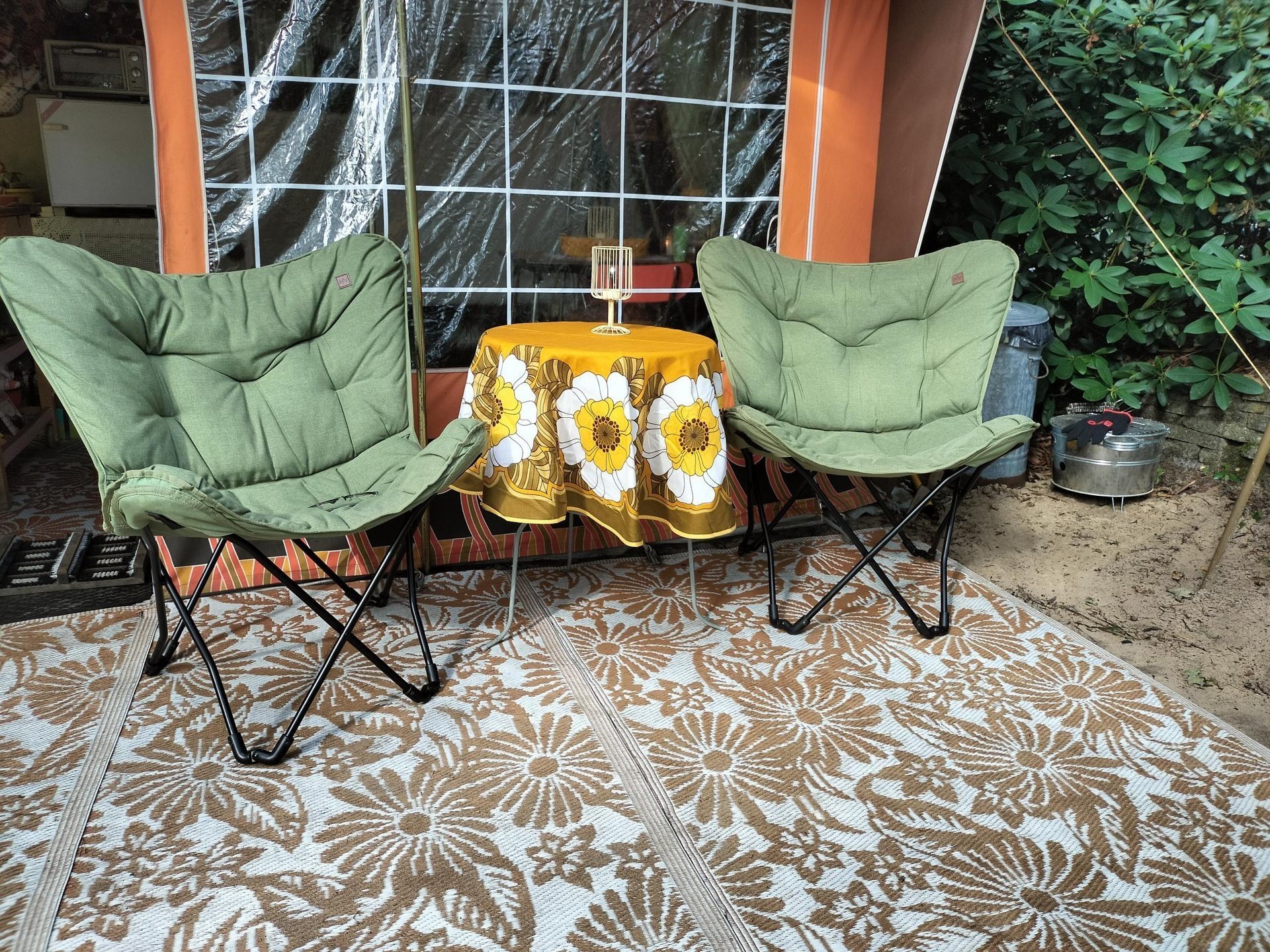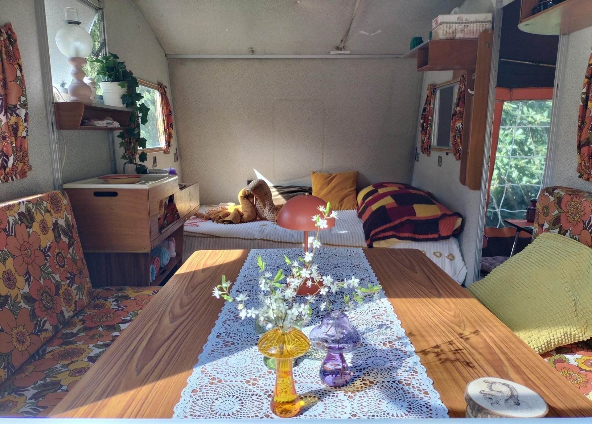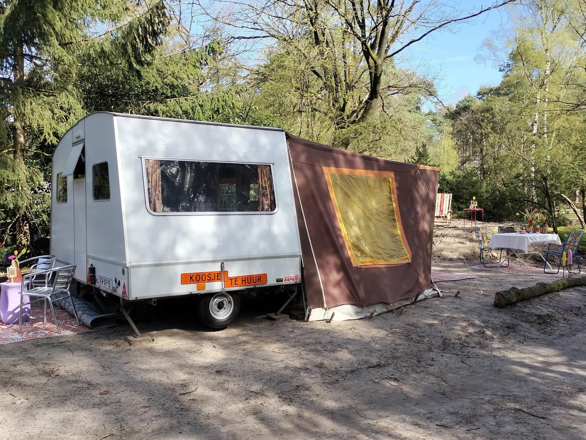 Koosje, de vintage klapcaravan uit 1976, stond voor het eerst in 2023 op Landgoedcamping Het Meuleman, met haar originele voortent. In 2024 en 2025 keerde ze terug en ook in het kampeerseizoen van 2026 staat ze weer klaar. Ze staat op een prachtige plek, nummer 55, vlakbij het heideveld.